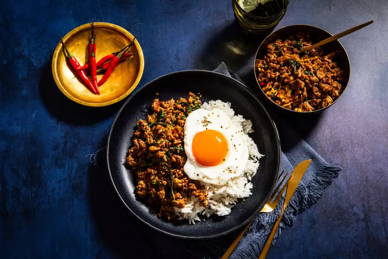 پد تای (Pad Thai) آیکون استریتفود تایلند است؛ نودل برنج را در واک با سس تمرهندی، سس ماهی و شکر نخل تفت میدهند تا توازن ترش-شیرین-شور شکل بگیرد. تخممرغ، سیر، جوانه لوبیا و پیازچه، بافت و عطر اضافه میکنند و میگو یا مرغ انتخابهای معمول پروتئین هستند. سرو نهایی با بادامزمینی خرد و برش لیموترش انجام میشود تا هم کرانچ دلچسبی داشته باشد و هم در لقمه آخر، لیمو طعمها را تیزتر کند. اگر رژیم گیاهی دارید، نسخه «Jay» با توفو و جایگزینی سس ماهی با سس سویا هم در بسیاری از غرفهها موجود است.