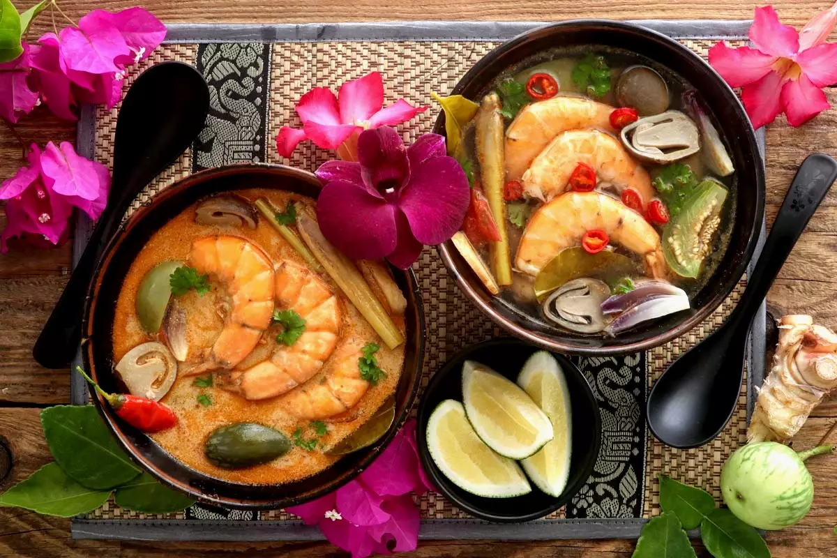 تام یام گونگ (Tom Yum Goong) سوپ پرآوازه تایلند است که محوریت آن میگوهای تازه و رایحههای گیاهی قدرتمند است. علف لیمو، برگ لیمو کافیر و گالانگال کنار فلفلهای تازه و قارچ، در آبگوشت جمع میشوند و با سس ماهی و آبلیمو به نقطه تعادل میرسند. نتیجه، سوپی تند و ترش و بسیار معطر است که اشتها را باز میکند و در نسخه «Nam Khon» کمی شیر یا شیر تبخیرشده به آن افزوده میشود تا بافتی کرمیتر و نرمتر پیدا کند. این انتخاب برای عاشقان غذاهای دریایی، یک شروع کلاسیک و بیخطر به شمار میرود.