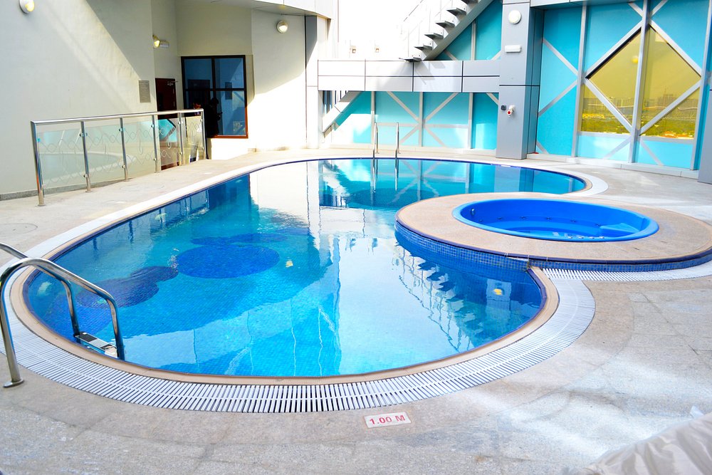 استخر روباز با سقف متحرک: چشمانداز باغ یا شهر، مناسب شنا و آفتابگیری.