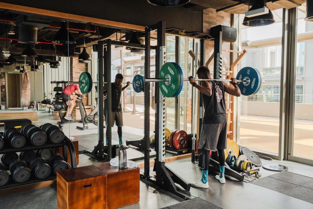 باشگاه ۲۴ ساعته: دستگاههای بدنسازی چوبی و باشگاه یوگا در فضای باز.